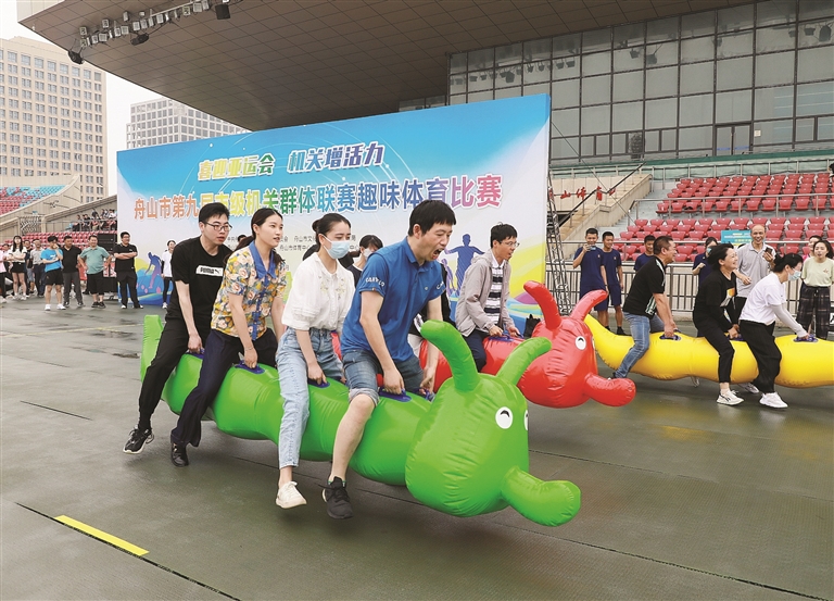 前天,“喜迎亚运会 机关增活力”第九届市级机关群体联赛趣味体育比赛在舟山体育场举行。55家市级单位近300名体育爱好者参加企鹅漫步、毛毛虫竞速和快乐铅笔等趣味活动。摄影 记者 张磊