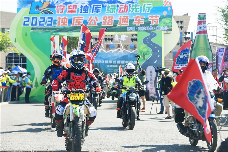 6月18日,在新疆克拉玛依市独山子区独库大本营广场,车手骑着摩托车准备前往独库公路。