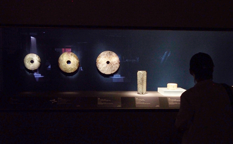 6月19日在特展上拍摄的上海青浦和金山地区出土的玉璧和玉琮。