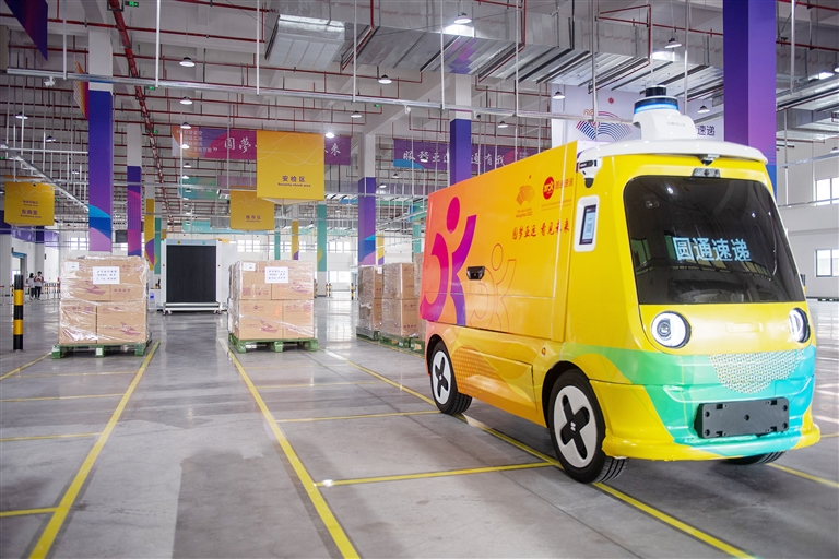 6月21日,无人车在第19届杭州亚运会物流中心内转运包裹。 新华社记者 江汉 摄