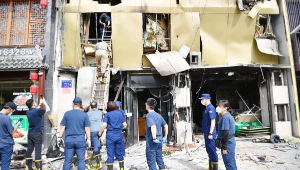 6月22日,应急管理部派工作组人员进入银川市兴庆区富洋烧烤店燃气爆炸事故现场进行勘查。 新华社记者 王鹏 摄