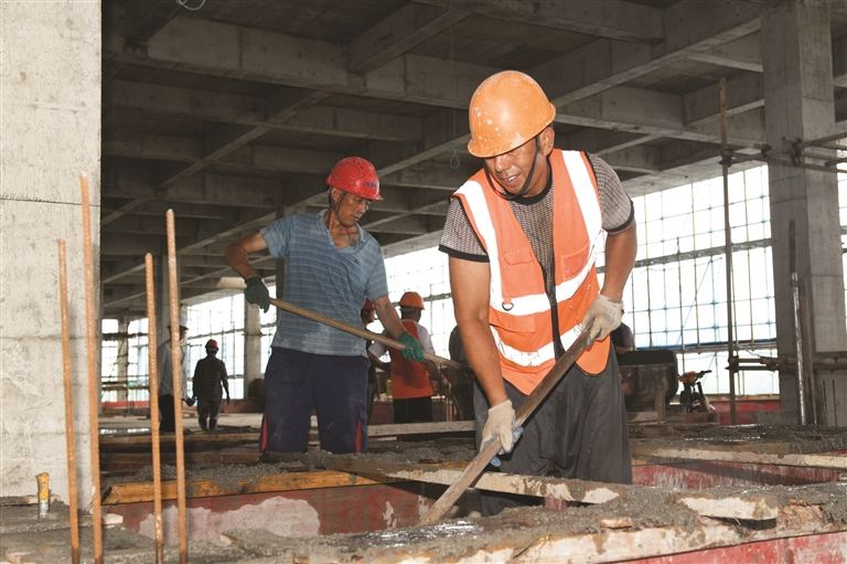 端午3天假期,今年64岁的泥工组组长鲍小平一直坚守在工地上。采访当天雨水连绵不绝,室外工地都停掉,主要是做室内项目,泥工组要负责砌墙和浇筑混凝土(见图)。“因为这个项目是专门为水产企业打造的厂房,防水要很注意,在混凝土翻边的操作中一定要规范施工。”鲍小平一直在工地上把控各个施工环节。