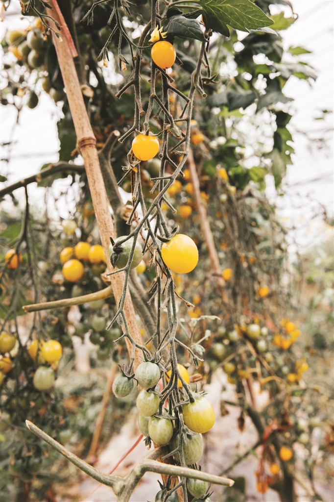 这里光种小番茄的大棚就非常巨大,里面种植了六七种番茄,红的、黄的;单个长的,像灯笼成串的,各种各样。很快,一个小篮筐就被装得满满的。