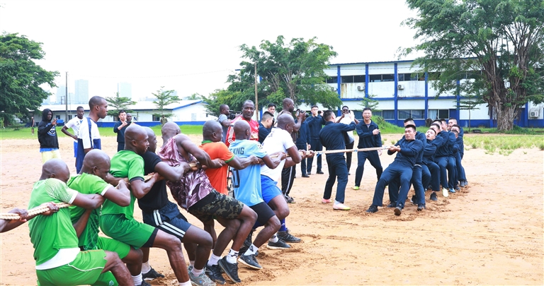 6月24日,中国海军第43批护航编队官兵与科特迪瓦海军官兵在科海军基地进行拔河友谊赛。