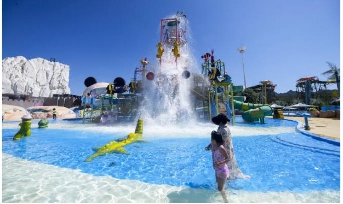 6月29日,游客在河北宽城满族自治县花溪城景区戏水游玩。