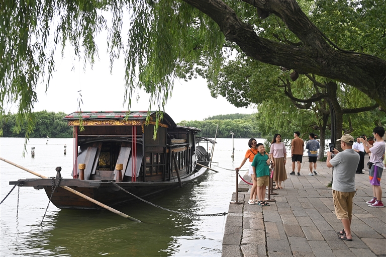 6月30日,游客在嘉兴南湖红船旁留影。近日,浙江省嘉兴市红色旅游持续升温,不少游客来到嘉兴体验红色旅游路线,赴南湖旅游区瞻仰红船、参观南湖革命纪念馆等。 新华社记者 黄宗治 摄