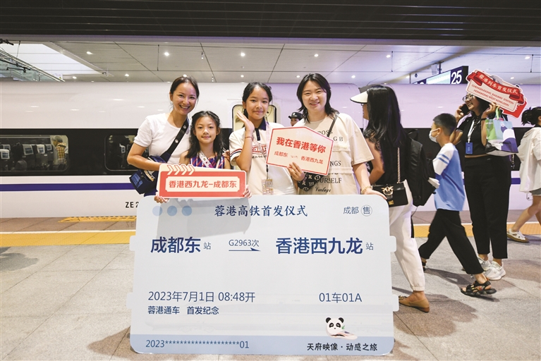 7月1日,搭乘成都东站开往香港西九龙站G2963次列车的旅客在成都东站站台上拍照留念。
