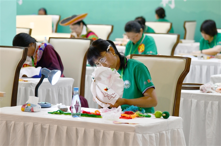 7月3日,在第一届全国农民技能大赛上,选手参加手工刺绣项目比赛。