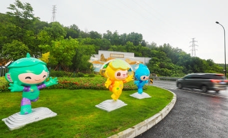昨天,东西快速路露水坑隧道口,杭州亚运会吉祥物“琮琮”“宸宸”和“莲莲”向进入舟山西的每一辆车“打招呼”。近期我市主干道、公园等处已基本设置了亚运标语或吉祥物,营造了浓郁的喜迎亚运氛围。