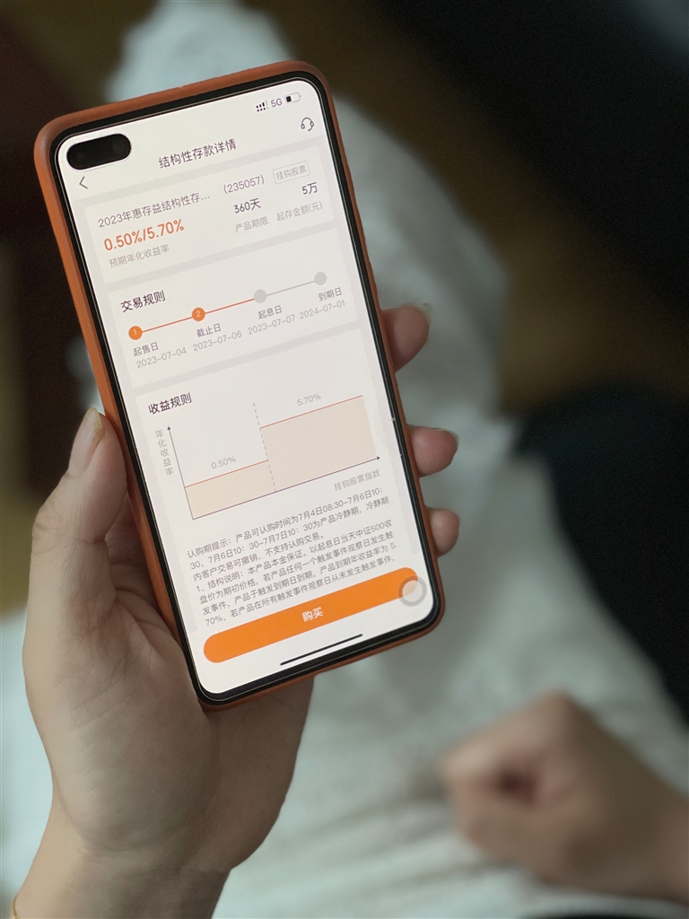 那么,结构性存款产品到底是什么?以7月4日记者查询的宁波手机银行正在发售的一款结构性存款产品为例,挂钩中证500指数的结构性存款产品,投资期限为360天,以起息日当天中证500收盘价为期初价格,预计收益率为0.55%或5.7%,在起息日后,每个月设置一个观察日,共计12个观察日。设立触发事件(观察日中证500指定盘价格高于期初价格),若产品任何一个触发时间观察日发生触发事件,产品于触发到期日到期,该产品就以高收益5.7%提前兑付。如果12个观察日中证500指价格均未能高于期初价格,产品则在到期后以0.5%的利率进行兑付。该产品还设置了冷静期,冷静期内客户交易可撤销交易。