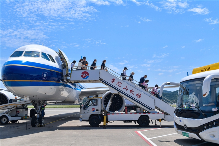 昨天上午10时18分,南方航空公司执飞的广州至舟山CZ5265航班,稳稳降落在普陀山机场。据统计,1~6月份,普陀山机场旅客吞吐量117.6万人次、运输航空起降1.1万架次,分别同比2019年增长60.3%和73.6%,多项指标创历史新高。摄影 记者 沈磊 通讯员 陈佳盈