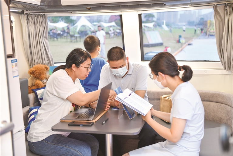 7月9日,在“遇见人才之家”宣传车上,工作人员正在介绍我市引才政策