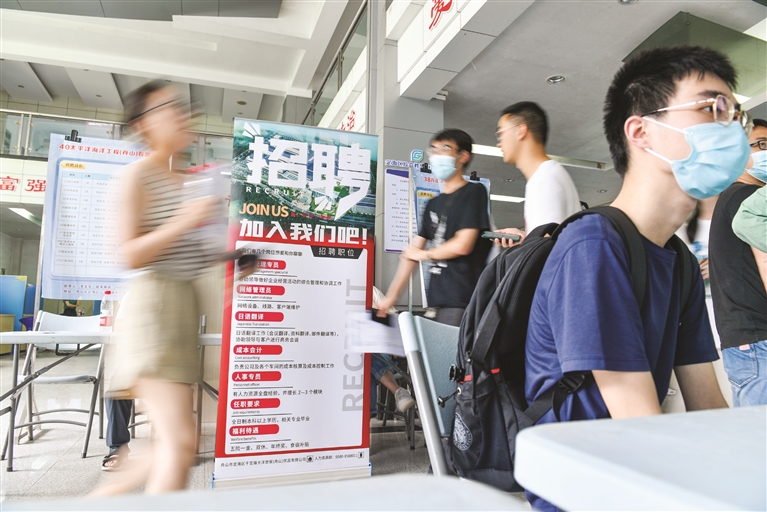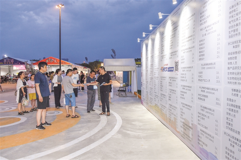 7月9日晚,在“职等你来”广告牌前,市民观看求职信息