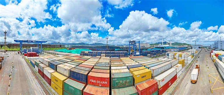 7月16日,在舟山港综保区码头,多艘船舶停靠进行装卸作业。据了解,今年上半年,综保区码头完成货物吞吐量280万吨,同比增长31.06%。 摄影 记者 陈永建 通讯员 徐迟