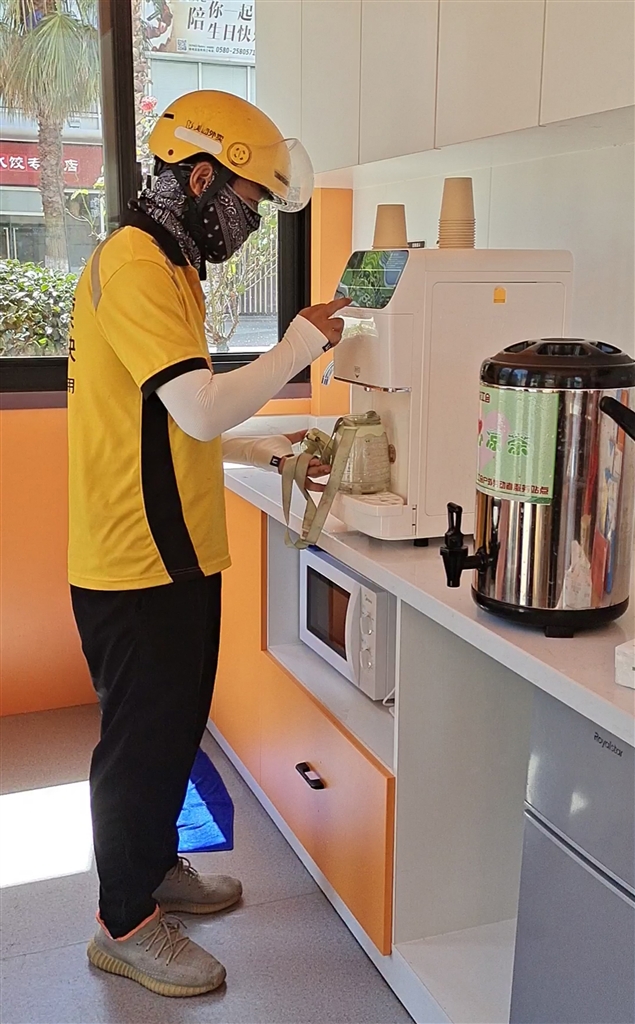 这个通体呈亮橙色,集装箱前卫造型的新驿站,总面积18平方米,设有洗手台、桌椅、沙发、阅读角,配备了充电宝、饮水机、小型冰箱、微波炉等电器,还为户外劳动者准备了医药箱、便民服务箱以及口罩、酒精、劳保手套、一次性雨衣等实用物品。步入盛夏后,该驿站迅速成为所在商圈外卖配送员的热门“休憩地”。