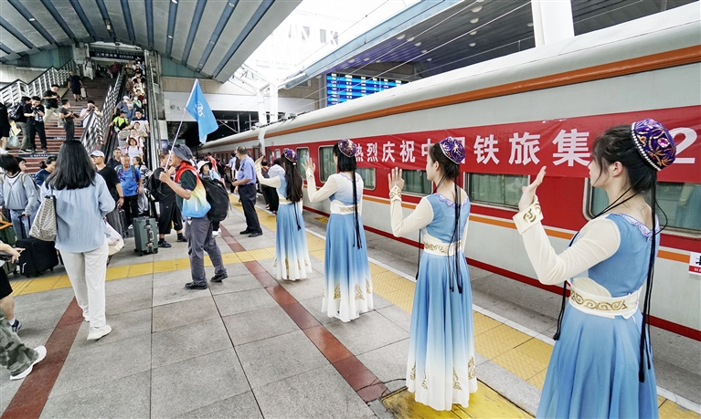 7月24日,旅行社的员工在北京西站站台上欢迎游客登车。当日,北京到新疆和田的京和号旅游专列准时从北京西站出发,这是中国铁路北京局集团2023年首趟开往新疆的旅游专列。京和号援疆旅游专列自2015年起先后开行28列,累计运输游客约1.4万人次,有效促进了北京与新疆和田两地交流,成为北京与新疆旅游互通的桥梁。 新华社记者 李欣 摄
