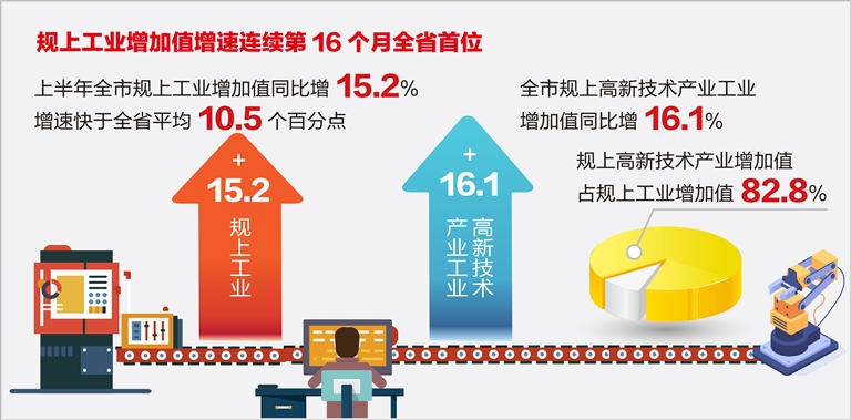 规上工业增加值增速连续第16个月保持全省首位,高新技术产业增加值占规上工业增加值比重位列全省首位