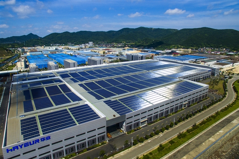 从空中无人机视角俯瞰,该公司厂区,办公楼、生产车间的屋顶上,黑色的太阳能板整齐排列,在炎夏的烈日中熠熠生辉,持续不断地为整座工厂提供清洁能源。