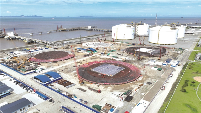 近日,在位于高新区的浙江舟山液化天然气(LNG)接收及加注站三期LNG储罐及配套设施项目工地,施工人员正在紧张施工中。获悉,三期项目计划投资38亿元,将新增4座22万m3全容罐及配套设施,预计2025年9月建成投产。摄影 记者 陈永建 通讯员 陈如详