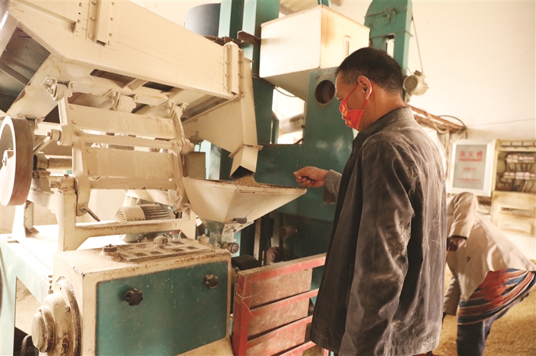 7月25日,在莫桑比克马普托省博阿内地区,中国技术员张浩波在中莫农业技术示范中心加工水稻。