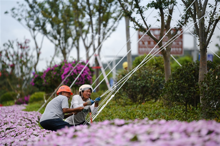 7月30日,普朱管委会组织工作人员,对金沙大道、银雁路等主干道两侧的行道树进行修剪、加固等工作,增加其抗风能力,消除安全隐患 摄影 记者 姚凯乐