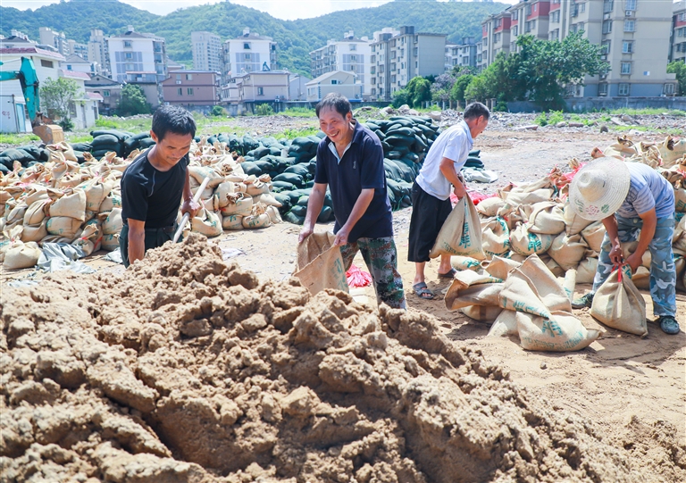 7月31日,定海青垒头路附近,工人们正在装防洪沙袋摄影 记者 张磊