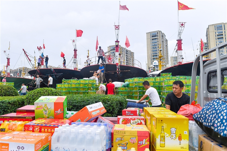7月30日,岱山县高亭中心渔港,渔民正在把抗台物资和食物搬运上船 摄影 记者 沈磊