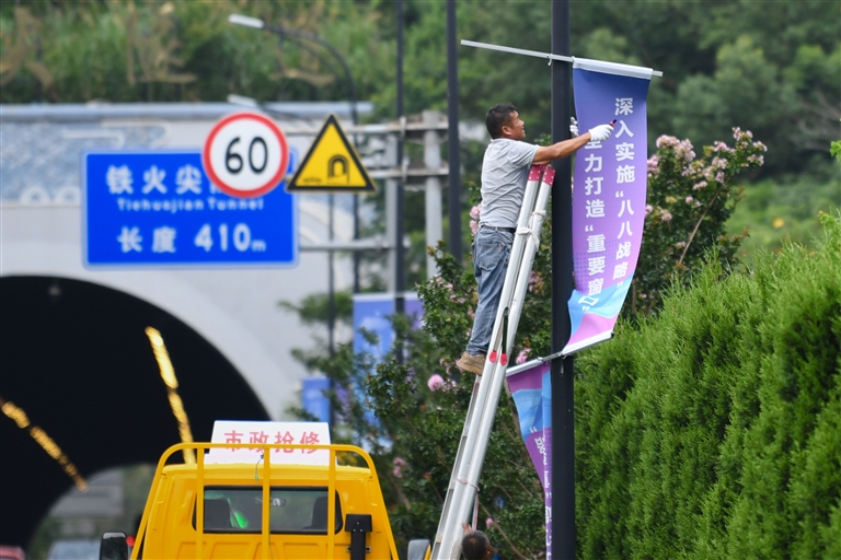 昨天,新城铁火尖隧道外,市政部门工作人员正在拆卸公路边的公益广告牌摄影 记者 姚凯乐