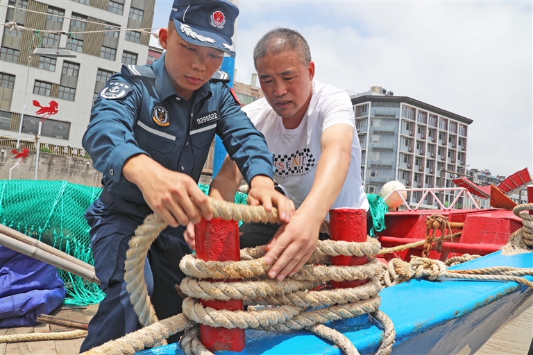 昨天,舟山海警局组织多名执法员,在沈家门渔港积极协助并指导在港避风的渔船做好防台准备工作 摄影 记者 陈永建 通讯员 吴陈杰