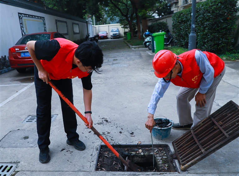 昨天,定海昌国街道北园社区,志愿者正在清理窨井口的垃圾和树叶,确保下水道排水通畅摄影 记者 张磊 通讯员 林叶