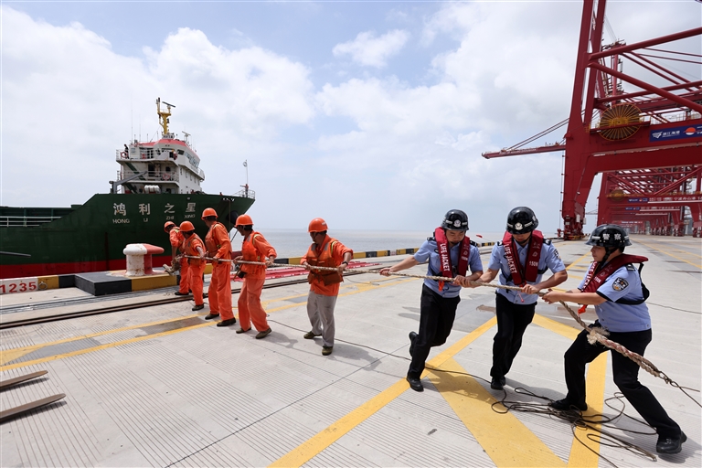 昨天,舟山出入境边防检查站执勤四队民警联合南洋船厂工人,对在修船舶系缆加固 摄影 通讯员 姚峰 胡晓亮