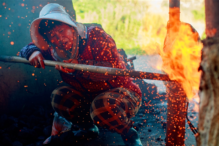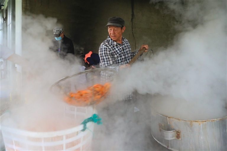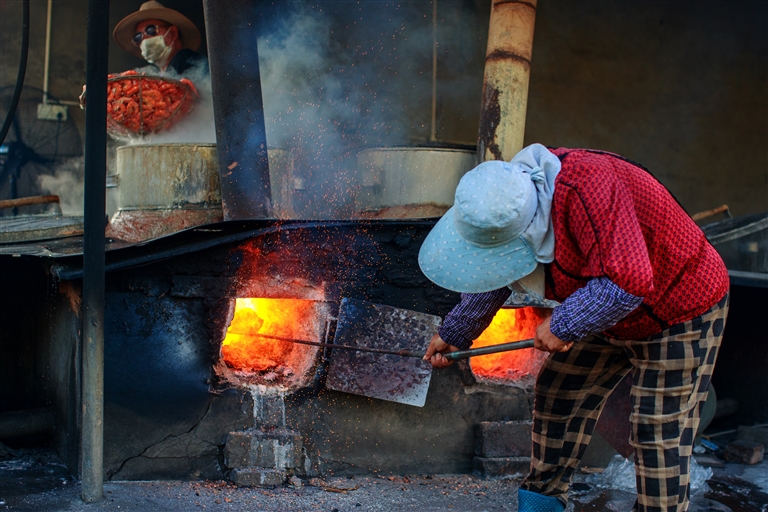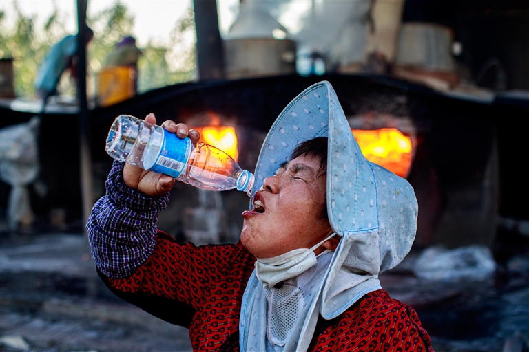 时下岛城已是酷暑中伏天,裴学凤每天围着火炉工作。高温烘烤着周围的一切,裴学凤手中的工作却没有丝毫停歇,生火、撒盐、翻搅……不知不觉,汗水浸湿了她的衣服。裴学凤笑着说:“衣服总是湿了干,干了湿,流点汗没什么,已经习惯了炎热的环境。”说完她几口就喝完了一瓶水。