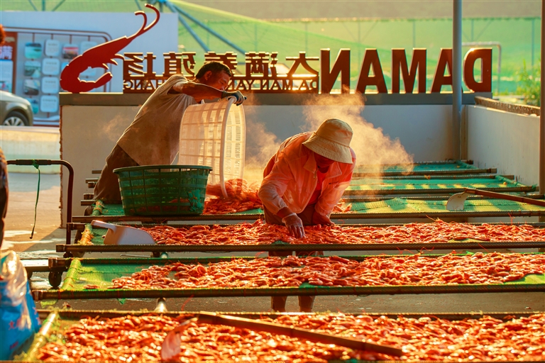 凌晨4时,天刚蒙蒙亮。长白岛后岸村的“离岛耕海”共富工坊内,裴学凤早已忙碌开来,烤制着刚刚捕捞上来的南美白对虾。