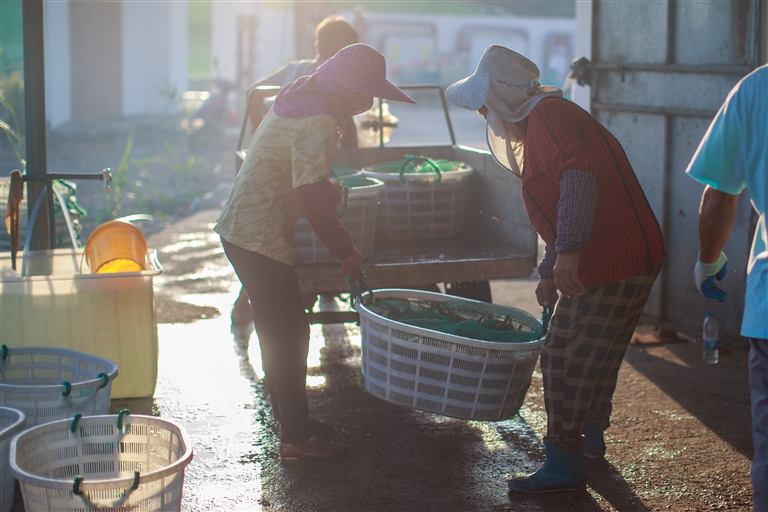 共富工坊,共富有你。“离岛耕海”共富工坊(大满养殖场)包括7个水产养殖场,养殖总面积2000余亩。一半以上的工人来自于村里的富余劳动力,主要从事对虾捕捞、烤制等工作,当地村社劳力闲置难题得到解决。