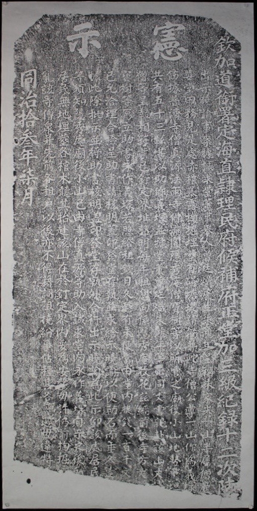 钦加道衔、署定海直隶理民府、候补府正堂、加三级记录十二次陈(为)出示晓谕事。案据诚求堂董事举人曾廷炽、廪生朱鸿年呈请:朱家尖一山半属僧产,(奉饬办理)婴堂田务,见是处赤棺暴露,掏掘埋葬有碍塘堤,请饬普陀寺僧公遵一山作为义冢(等情。当经)饬据普济寺僧真源、法雨寺僧满圆、隐秀庵僧宝树等,以所管之庙后小山地势平坦,(泥土深厚,)共有五十三亩堪以助作义冢。并据堂董曾廷炽、朱鸿年等带同文书,亲赴该山丈(计亩数,与该)僧等呈报相符,业已钉定界址。声明每年租息向系隐秀庵收花,兹经前后寺方丈、(隐秀庵住僧)宝树等,写立助书,永作义冢。若照给租钱,日久恐有未便,当由堂内提钱一百千文(归寺生息。事)已允洽,理合检呈助书,请核明盖印,发堂存执。并求给示晓谕,以便勒石而垂久远。(各等事情到府。)据此,除批示,并将助书核明盖印、发堂存执外,合行出示晓谕。为此示,仰该处居民(人等知悉:尔)等须知隐秀庵庙后小山,已由寺僧真源等,助入诚求堂内,永作义冢。自示之后,所(有附近土客、)居民无地埋葬,各棺木听其抬赴该山,在于钉定界内妥为安葬,毋须仍前掏掘(塘堤,及越界紊)乱该寺僧众。并先前各租户,以后亦不得藉词阻挠,纷争占种。其各凛遵,毋违。特(示。)同治拾叁年柒月。