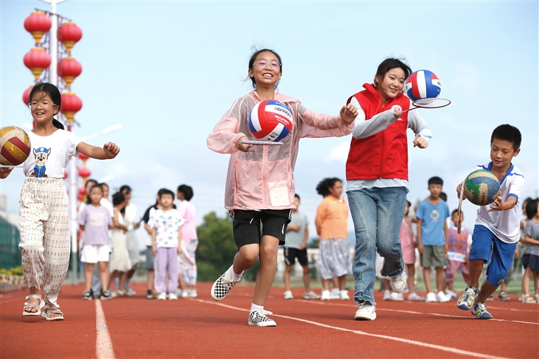 8月1日,在即墨区龙山街道前东葛村新时代文明实践站,大学生志愿者与学生们一起玩“托球跑”游戏。