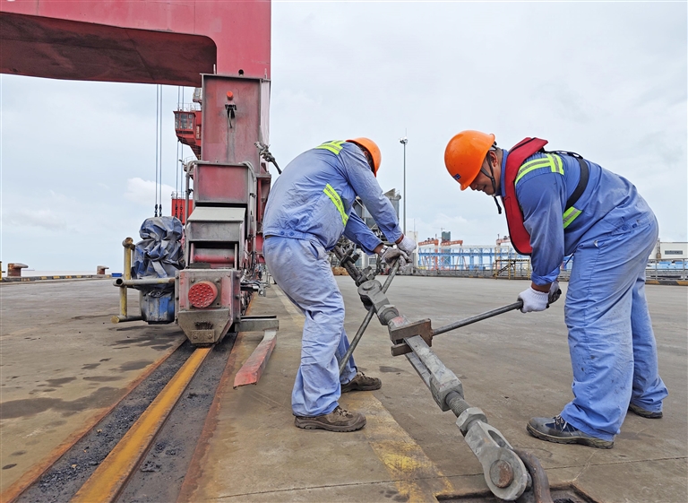 8月2日,多名工人在舟山综保区码头加固门座式起重机,全力抵御台风“卡努” 摄影 记者 陈永建 通讯员 陈谦益