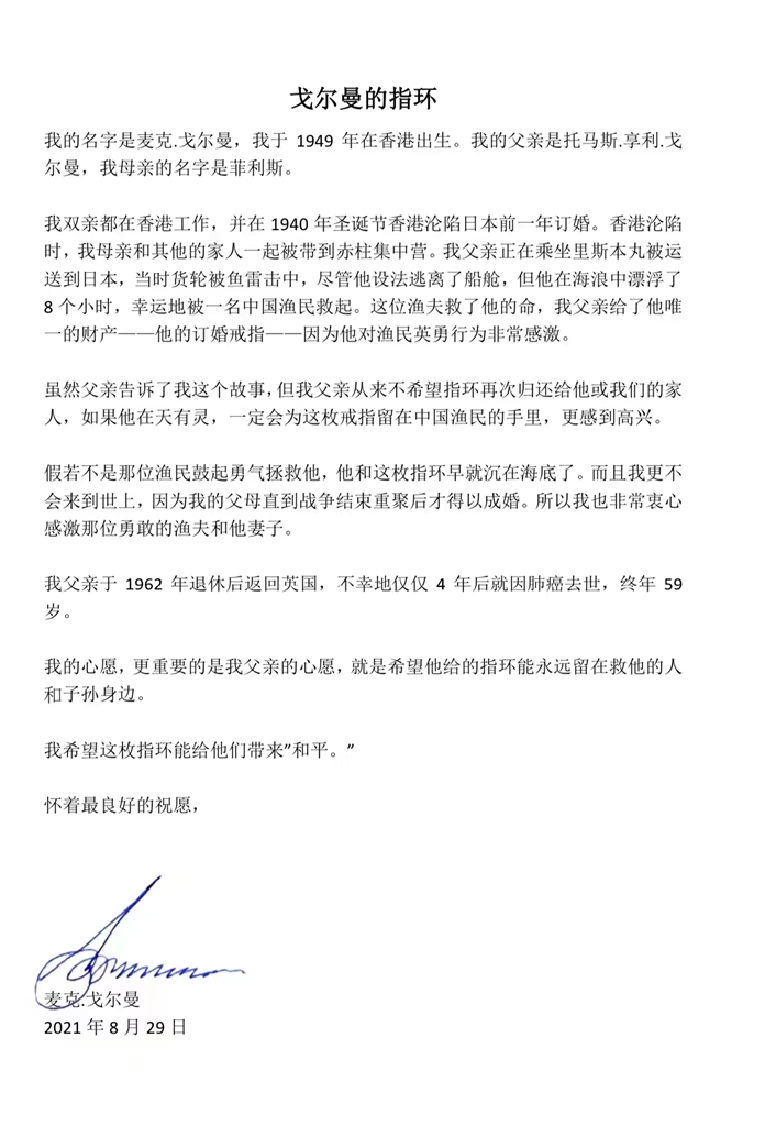 2021年,麦克·戈尔曼将一封感谢信交给了沈健,希望他能转交到当年救助父亲的渔民或家属手中。“戈尔曼1949年出生于香港,本人并未见过父亲口中的那枚戒指,所以很难证实刘竹君家留存的戒指是否就是戈尔曼父亲当初赠予的那枚,但他依旧想通过这封感谢信感谢舟山渔民,尤其是当年救过父亲的那位老渔民。”沈健收到感谢信后,第一时间将它寄到舟山。