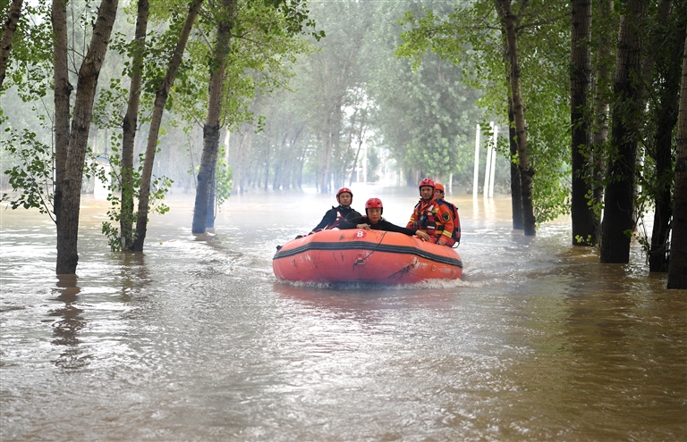 8月3日,衡水市消防救援支队救援人员前往涿州市码头镇沙窝村开展救援工作。 新华社记者 牟宇 摄