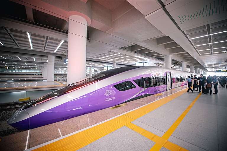 当日,由浙江交通集团购置、为杭州第19届亚运会量身定制的复兴号亚运智能动车组搭载近百名乘客从杭州西站出发,在合杭高铁湖杭段开启首次试乘活动。复兴号亚运智能动车组采用杭州亚运会主形象色“虹韵紫”涂装,针对浙江多丘陵山地的地形特点采用定制化的技术创新方案,提升了乘客的乘坐舒适度,将在杭州亚运会赛事期间承担重要的交通转运功能。