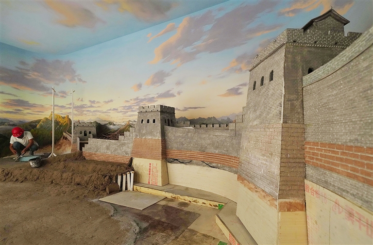 8月4日,工人在山海关中国长城博物馆进行内部装修施工。
