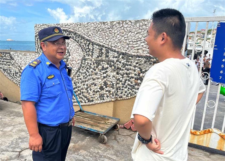 在东极,有这么一位城管队长,用脚步丈量民情。夏季,他护航海岛旅游,保障市容环境;冬季,海岛旅游进入淡季,他做好小岛民宿装修规划监管,为东极发展保驾护航。他就是普陀区东极镇综合行政执法中队中队长(派驻)张磊(图左)。