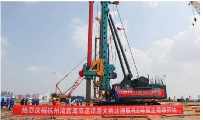 8月10日,中铁大桥局施工人员在杭州湾跨海铁路桥北航道桥主塔墩钻孔桩施工平台操作旋挖钻机作业。当日,杭州湾跨海铁路桥北航道桥主塔墩首根钻孔桩开钻,标志着南通至宁波高铁控制性工程杭州湾跨海铁路桥施工取得突破性进展。杭州湾跨海铁路桥全长29.2公里,包括北、中、南3座航道桥和跨大堤、海中、浅滩区引桥,属超长高速铁路桥梁集群工程。此次中铁大桥局施工的北航道桥8号主塔墩钻孔桩率先开钻。杭州湾跨海铁路桥是南通至宁波高铁控制性工程,大桥全程跨海,为设计时速350公里的双线高速铁路桥。大桥于2022年11月开工建设,预计于2027年底完工。新华社记者 黄宗治 摄