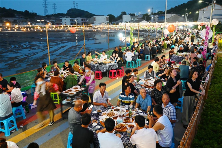 本届海蜇文化节上,双合村5家民宿主联手打造了一场海蜇千人盛宴,置办了75桌渔家海蜇宴(见图),村民们齐出动,帮厨、上菜、打理场地……“村里好久没这么热闹了,今天一早就开始忙了,越忙心里越高兴。”村民徐松儿感慨。