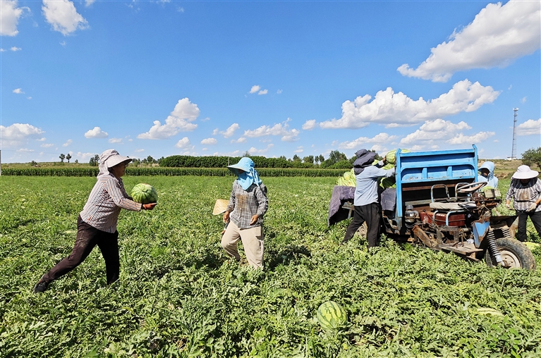 8月12日,内蒙古乌审旗无定河镇河南村农民在采摘西瓜。