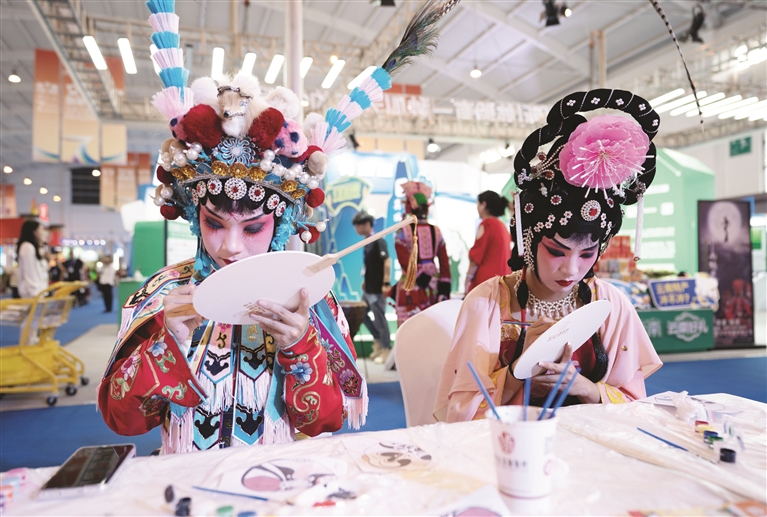 8月16日,在南博会文化旅游馆滇剧展演区,两名来自云南省滇剧院的演员在扇子上绘制脸谱。