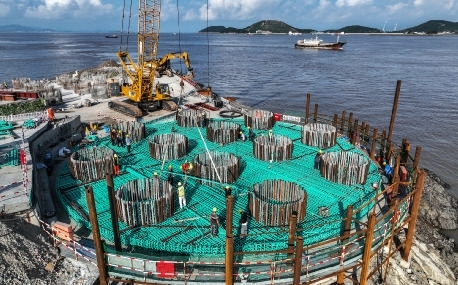 8月20日清晨,六横公路大桥二期工程双屿门大桥建设工地,工人们迎着朝霞施工忙。