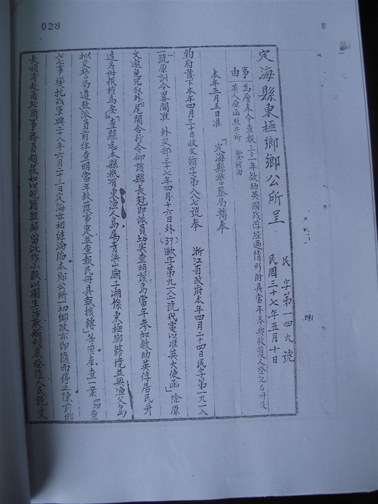 1948年5月,当时的东极乡根据政府要求,对“定海县东渔人岛居民”救助英俘事实进行了调查,查列出胡阿法等198位渔民的简要情况,上报了一份《定海县东极乡乡公所呈》(以下简称《呈件》),附了《定海县东极乡三十一年十月二日参加救护英俘居民登记名册》(以下简称《救助清册》),之后浙江省政府依此发布了《褒扬清册》,这是目前为止各界长期使用的营救人员依据。因为当时调查仓促,此《救助清册》未将不愿接受“褒扬”人员列入,也未能顾及人员流动等因素,同时《呈件》与《救助清册》的差异也未受到关注,故而是有明显瑕疵的。