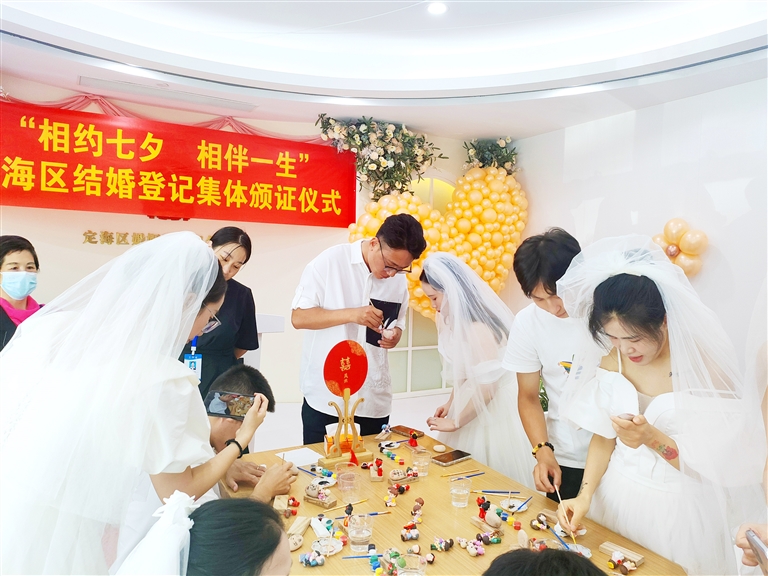 昨天,普陀区婚姻登记管理服务中心也是一派喜气洋洋,大厅坐满前来登记结婚的男女青年,现场还举行了婚俗改革宣传、爱情许愿瓶制作、爱情多巴胺相框制作等活动。下午,该中心组织一批新婚夫妇,在展茅街道路下徐参加穿针乞巧、投壶取巧、钓巧果、幸福上上签等趣味闯关活动。