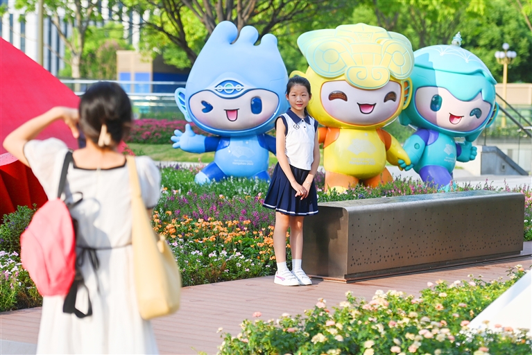 小朋友在位于杭州市拱墅区的武林广场与杭州亚运会吉祥物合影(2023年8月21日摄) 新华社记者 黄宗治 摄